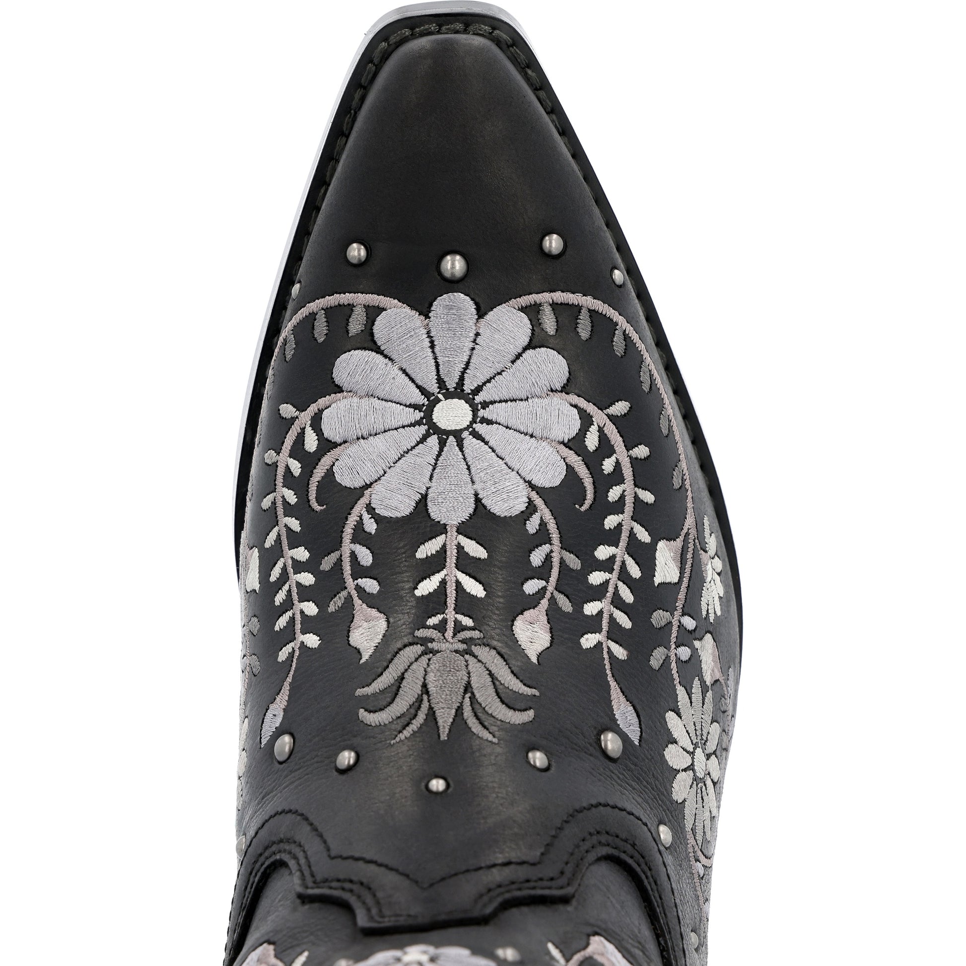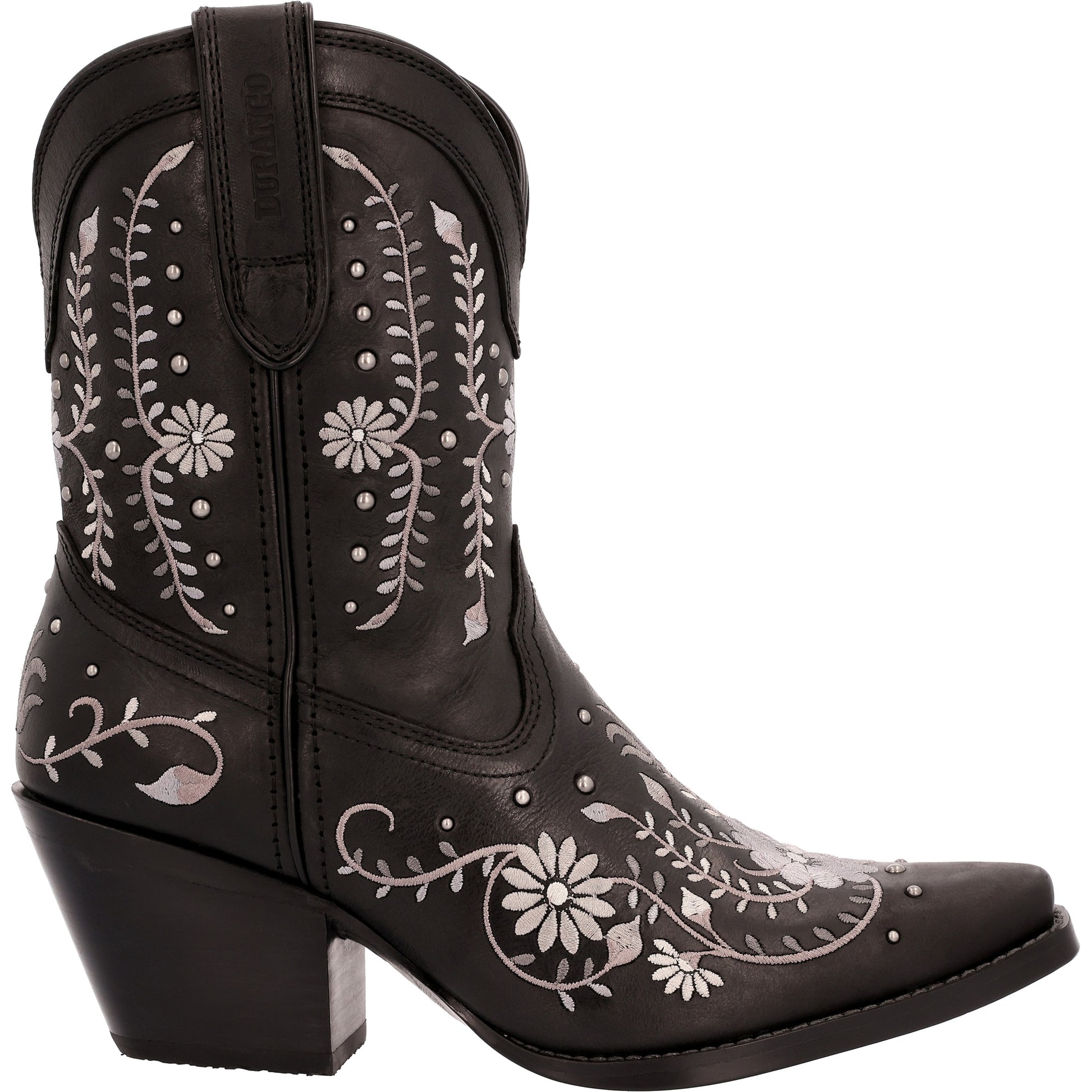 This is the women's 8" Western Sterling Wildflower Bootie Crush by Durango . This style is full-grain leather that includes floral embroidery with antiqued metal hardware. Inside the boot is a soft mesh lining and the Durango Sole Comfort Footbed . This style has a nylon shank, single row sole stitch around the snip toe, rubber outsole with a vintage finish and 2 " fashion heel. Step into style and comfort in this women's 8" Western Sterling Wildflower Bootie Crush by Durango . Get a pair today.