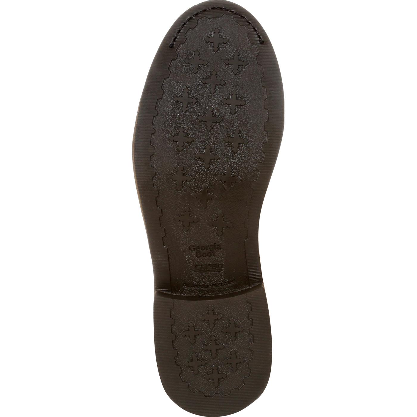 Georgia Boot Carbo-Tec Farm and Ranch pull-on boots have leather that's superior to the others on the market. The upper is hard-wearing SPR leather, a great material for dirty jobs because it's ready to take on caustic chemicals and common barnyard acids that dry out lesser leathers. SPR leather also is very soft and is broken in right out of the box. Comfortable work boots are important when you work long hours. These 11-inch wellington boots have the patented Comfort Core insole. It cushions your foot and pushes air through the insole with every step. The fiberglass shank provides arch support. The Carbo-Tec outsole is highly flexible so you can move with ease. It also resists chemicals, slips and oil.