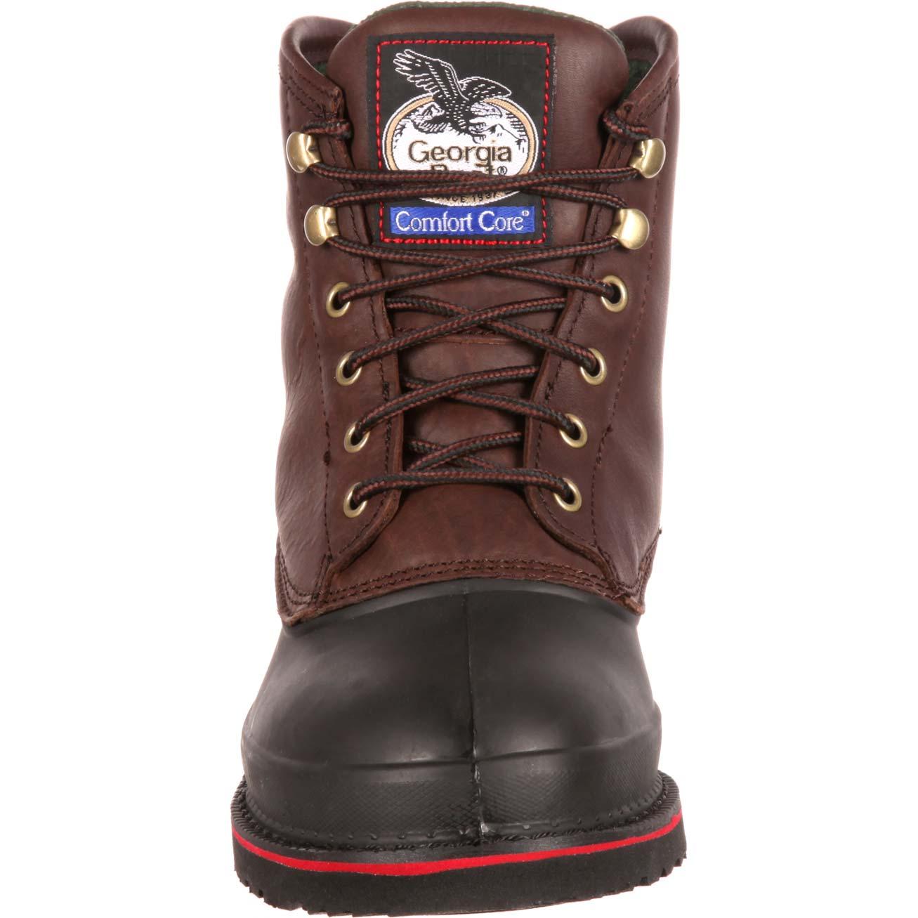 This Georgia Muddog work boot has been made from a combination of tough yet soft brown leather and a molded TPU shell. The shell is phenomenal because it obstructs water from getting into these boots, allows you to slop across mud-covered terrain without having the leather covered from top-to-bottom in it, plus it provides great protection against abrasions. The lace-up design is another great addition to the upper of these waterproof boots; it allows you to adjust the fit throughout the day and allows your feet to rest securely down inside of these boots. When you are wearing these work boots your feet will be shielded from falling objects and will be protected against electrical exposures. The footwear has been assembled in such a manner that allows it to meet the rigorous criteria set by the ASTM F2413 I/75 C/75 Protective Toe Classification and the ASTM F2413 Electrical Hazard Standard. The work boot's steel toe can withstand up to 75 lbs. of impact and compression. By combining a mesh lining (lightweight, soft and wicks away moisture) and the Georgia Waterproof System within the interior of these Muddog work boots, your feet will be given unbeatable dryness protection. Then you have the Comfort Core insole; it supplies outstanding cushioning and its Air Flow System (pushes air up through the insole) ensures that your feet remain dry and cool. On the bottom of this durable work boot, there is a Georgia Giant polyurethane outsole. In addition to the outsole being highly resistant to abrasions, slippage, chemicals and oil, it supplies great cushioning and its flexibility will allow you to move with ease. Looking for durable safety-toe footwear that will keep your feet dry and comfortable. Well, these Georgia Muddog waterproof steel toe boots are exactly what you have been seeking.