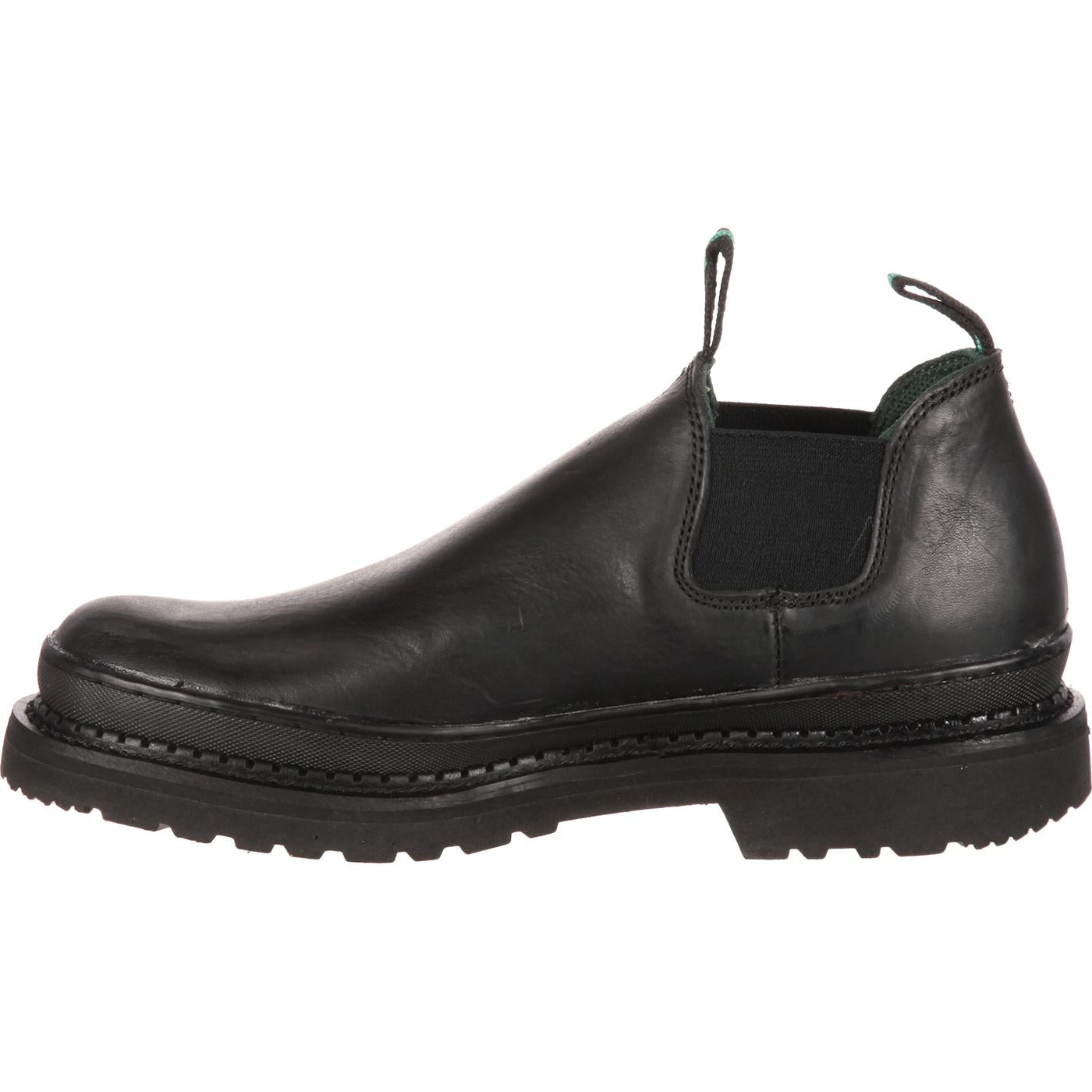 These Georgia Giant Romeos are comfortable and durable. The black work boots have full-grain leather that's durable and soft. A bumper guard just above the toe of the work shoes helps protect this comfortable footwear from abrasions and oils. The pull loops are strong and make it easy to get in and out of these shoes. Whether you're wearing these slip on romeo shoes for work or casually around town, your feet remain dry because these men's shoes have a high-performance lining that wicks moisture away. Your feet's comfort is guaranteed with the EVA midsole and covered cushion insole; the cushioning feels great and helps alleviate the pressure you put on your feet. To make the structure sound and durable, the Georgia Giant Romeo work shoes have Goodyear welt construction. A steel shank has been incorporated into the shoes for steady footing; it supports your foot arch and it gives the footwear more stability. The Georgia Giant polyurethane outsole is resistant to oil, abrasions and chemicals allowing it to be highly durable.