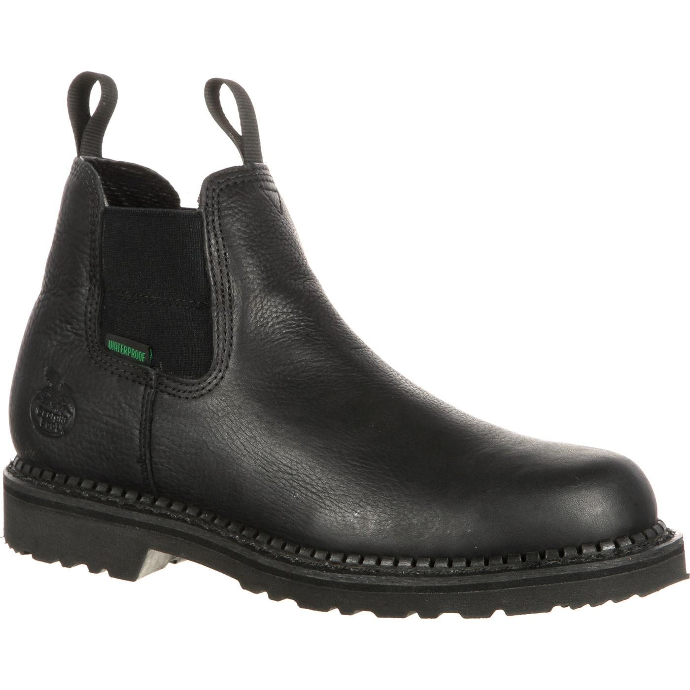 Made from full-grain leather, this men's Romeo is a great choice for a work shoe or for out on the town. Pull loops and twin gores make these black work boots easy put on and take off. Constructed with the Georgia waterproof system, your feet will stay dry. Inside the boots is a high-performance lining, and a steel shank to support your arch. The removable cushion insole provides lasting comfort. The Georgia Giant polyurethane outsole is a good base for this shoe and is paired with an EVA midsole. This boot is five inches high. That's the height of a standard hiking boot and taller than the traditional four-inch Romeo. The style will look good with jeans or dress pants and this Romeo can be worn just about anywhere. For a waterproof Romeo boot you'll enjoy wearing, get the Georgia Giant from Georgia Boot.