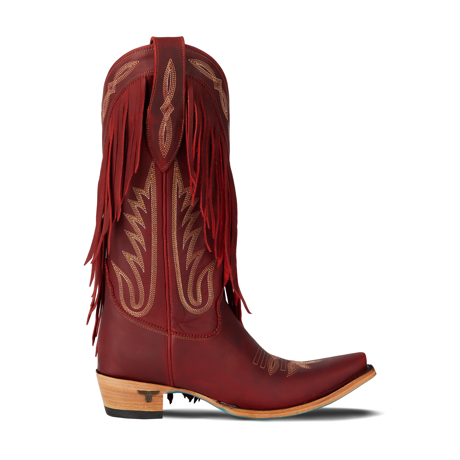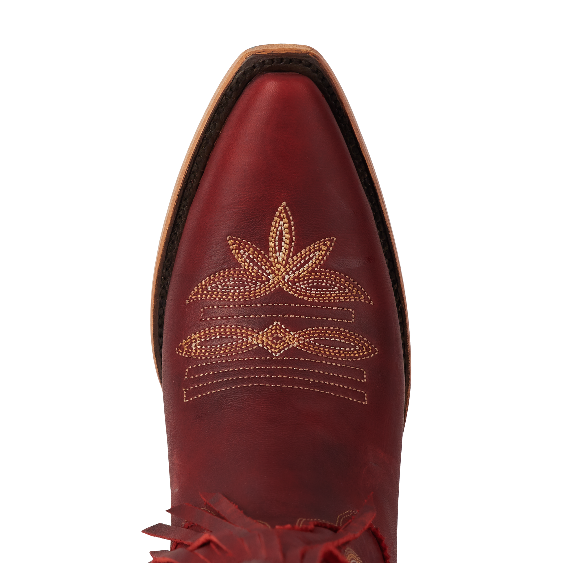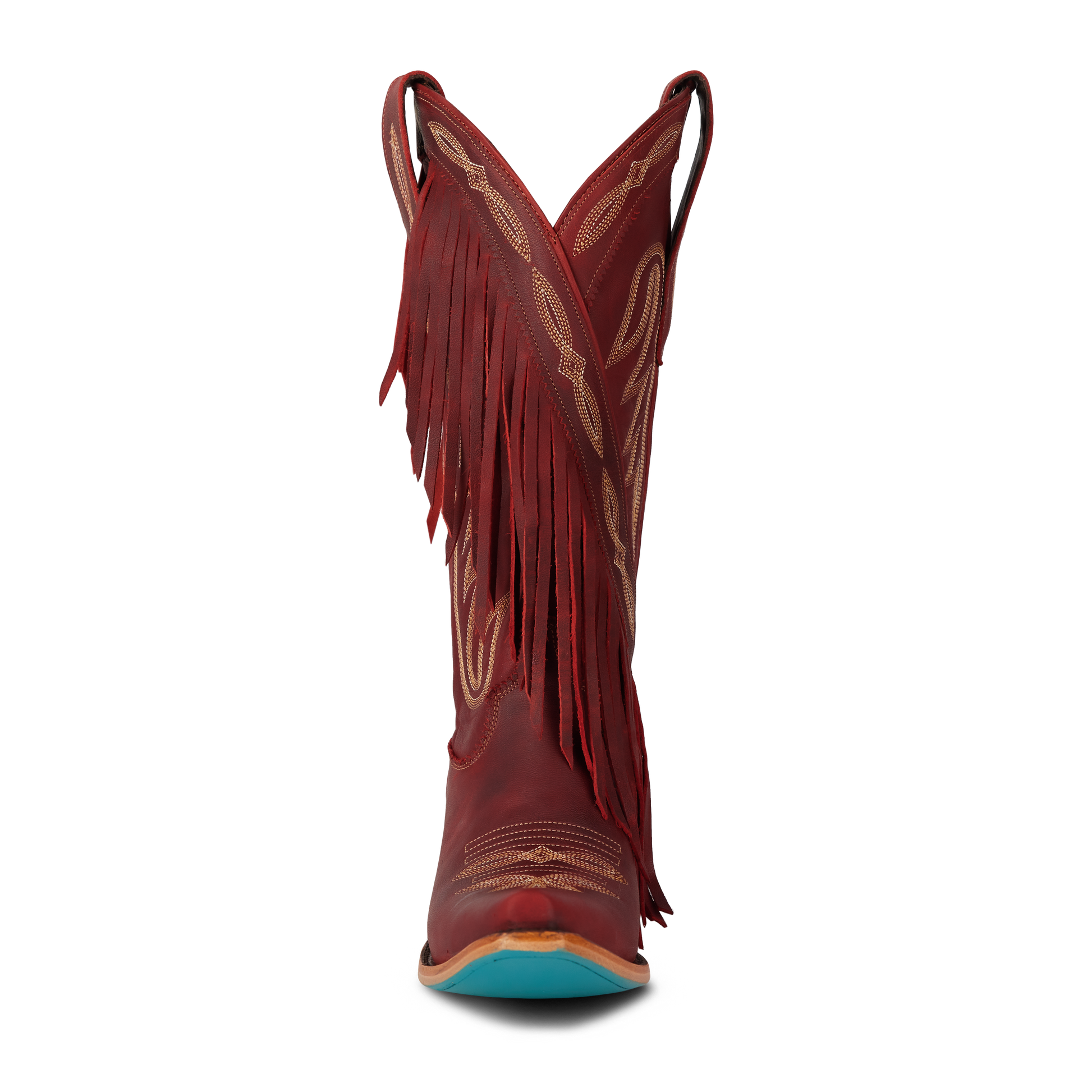 From rodeo to runway this chic boho western cowgirl boot is ready for wherever the night takes you. A modern play on traditional flame stitch & asymmetrical fringe detailing. She's a must have in your closet.